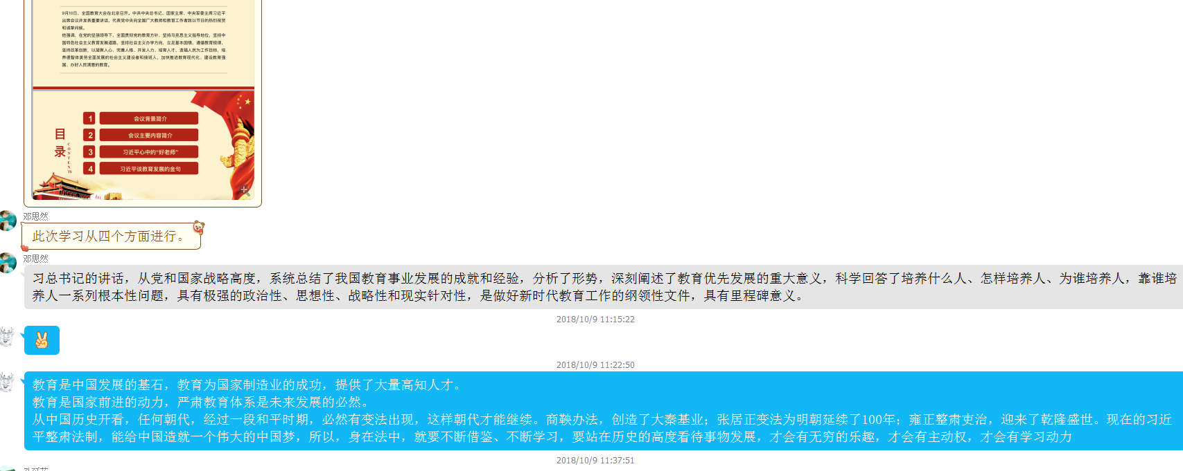 10月9号上午,机关党支部全体党员大会以网络形式,在机关QQ群中召开,这是机关党支部的一次有益尝试,由于机关党员目前因公或病不在校内人数较多,组织全体党员大会比较困难,为了基层党组织工作能够顺利进行,机关党支部打出了这样的口号:“人散群不散,一个也不能少”。经过支委们多次支委会讨论,完善了一整套会议要求和程序,致使这次党员大会得以顺利进行,他们首先要求按时网上报道,对每个议题提出意见和建议,对于学习要求拟写心得,党员们积极响应,按程序参与,为此次党员大会画上一个圆满的句号!