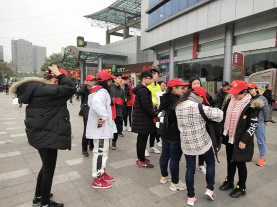 志愿者于下午一点半在学校西门集合。清点人数后,志愿者们一起步行到犀浦地铁站,在地铁站与买票的志愿者会合,分发地铁票。然后,大家一起搭乘地铁前往茶店子客运站。