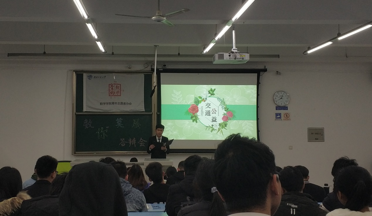 数学2018-01班先开始答辩。班长杨慧智和生活委员张效龙一起答辩。通过他们的答辩,我们知道他们的交通公益活动以“关爱人童,心系未来”为主题。他们考虑到儿童的交通安全意识不足这一当前热点社会问题,希望通过此次交通公益活动为解决这一社会问题做出自己的贡献,所以他们前往了一所幼儿园,教小朋友一些基本的交通常识,希望对小朋友们有所帮助,使他们的安全更有保障。