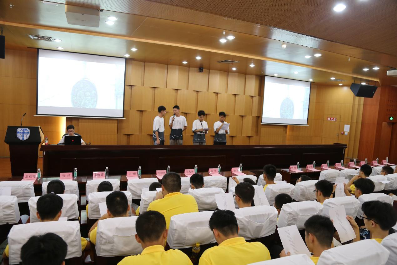 在19级辅导员王亚梅老师的引导下,由各班协理员带领,数院新生们在图书馆二号报告厅学唱校歌,18级同学罗迟驰、王军涵、毛家平、邓安沄负责教唱。