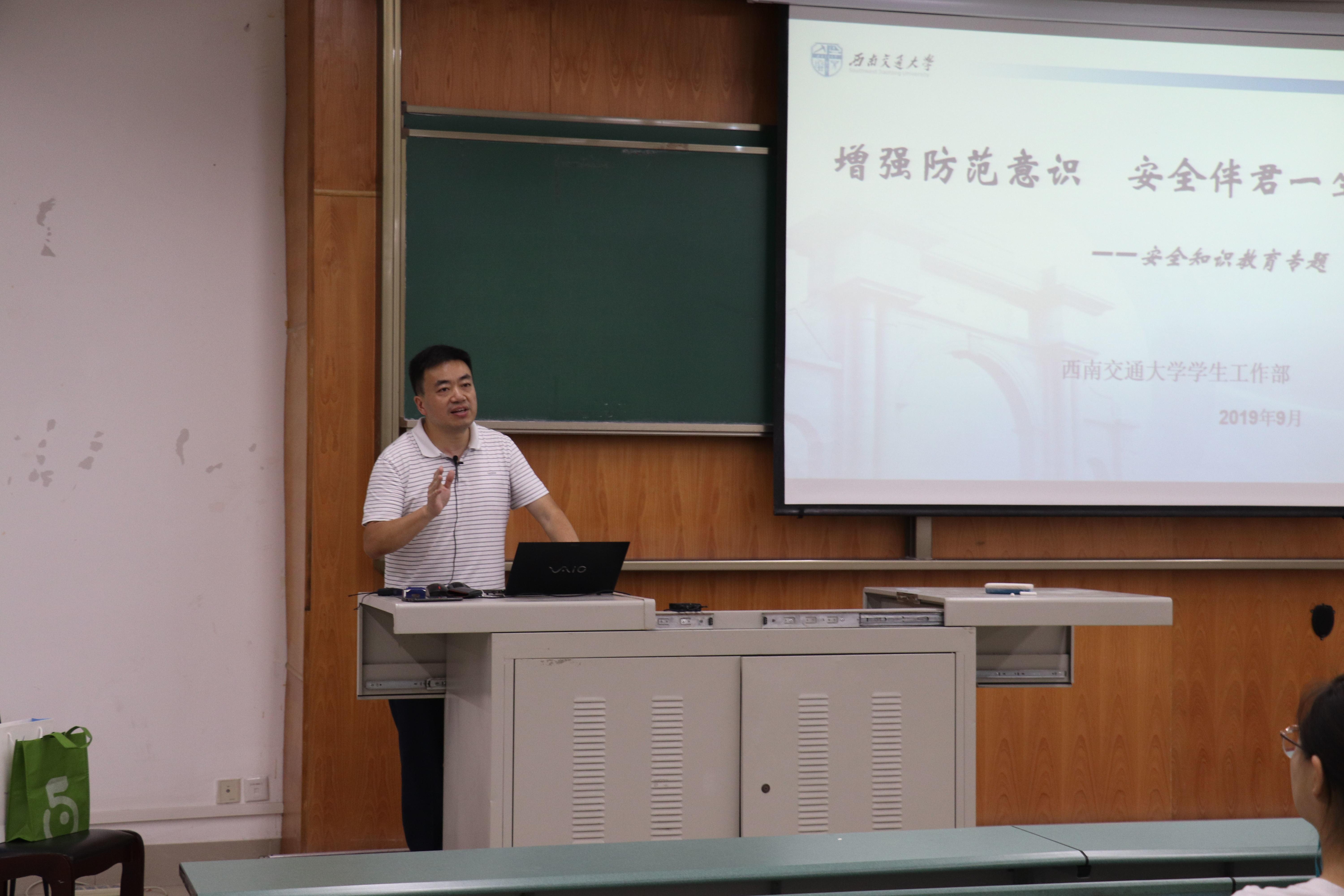 黄副书记分别从国家安全、言论自由与安全、消防安全、公共安全,个人安全等多个方面普及安全知识。在言论自由与安全方面,黄副书记提到,在如今网络沟通世界的时代,享有言论自由的同时也需谨言慎行,用词不慎会引发误会舆论造成恐慌。在公众场合,要注意自己的财产财物,要防盗防骗防抢。接着,黄副书记提到学校安全。在人口密集的宿舍,严禁使用违章电器,拒绝校园贷款,黄副书记还说到,四川处于多震地带,在座同学特别是外省同学平时要多学习防震知识,遇到余震不惊慌。最后,黄副书记运用生动的例子讲述心理健康。在遇到学业压力大,情感,家庭矛盾等的问题时不要焦躁,可以及时和学院老师,辅导员老师,班导师和班里同学沟通,寻求他们的意见与帮助。
