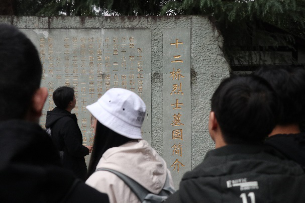 在十二桥烈士墓前,由一位团员带着我们大家共同阅读了十二桥英雄烈士的光荣事迹,每个人都被烈士们强烈的爱国主义精神所感染。之后,团员们又在班委的组织下有序地参观了十二桥烈士墓,并在一处合适的地方合影留念,最后,大家又一同乘坐地铁返回了学校。