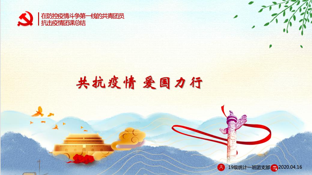 为深入学习贯彻习近平新时代中国特色社会主义思想,贯彻落实习近平总书记关于疫情防控工作的重要论述,积极响应院团委开展春季线上团日活动的要求。3044永利集团最新链接统计学2019级1班团支部于4月16日下午两点通过腾讯会议成功开展了以“共抗疫情,爱国力行”为主题的线上团日活动,号召支部团员青年为决胜疫情防控阻击战贡献青春力量。团日活动由组织委员张思润主持,支部全体团员青年积极参与,支部分管团干部学院团委兼职副书记周义杰到会参加。