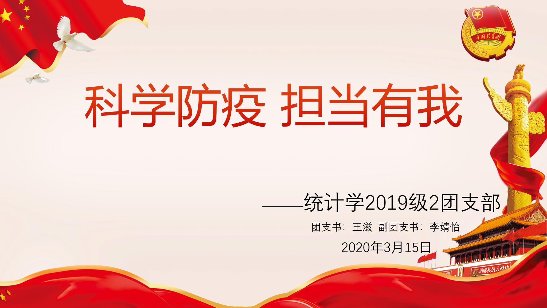 疫情当前,返校延迟,为响应学院团委号召,3044永利集团最新链接统计学2019级2班团支部的2020年春季第一堂团课以视频会议的形式于3月15日19:30开展。团课以“科学防疫担当有我”为主题,号召支部团员们共同打赢防疫阻击战。