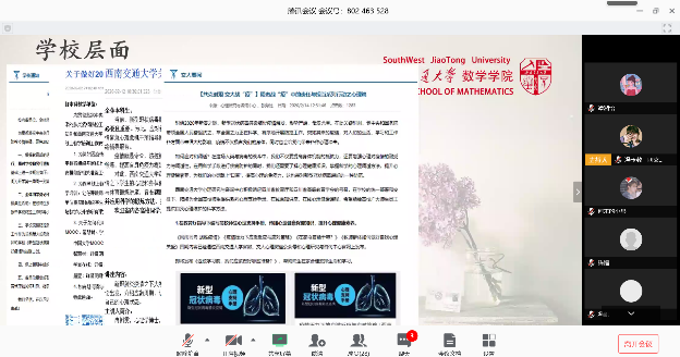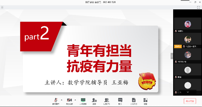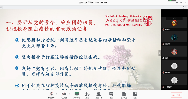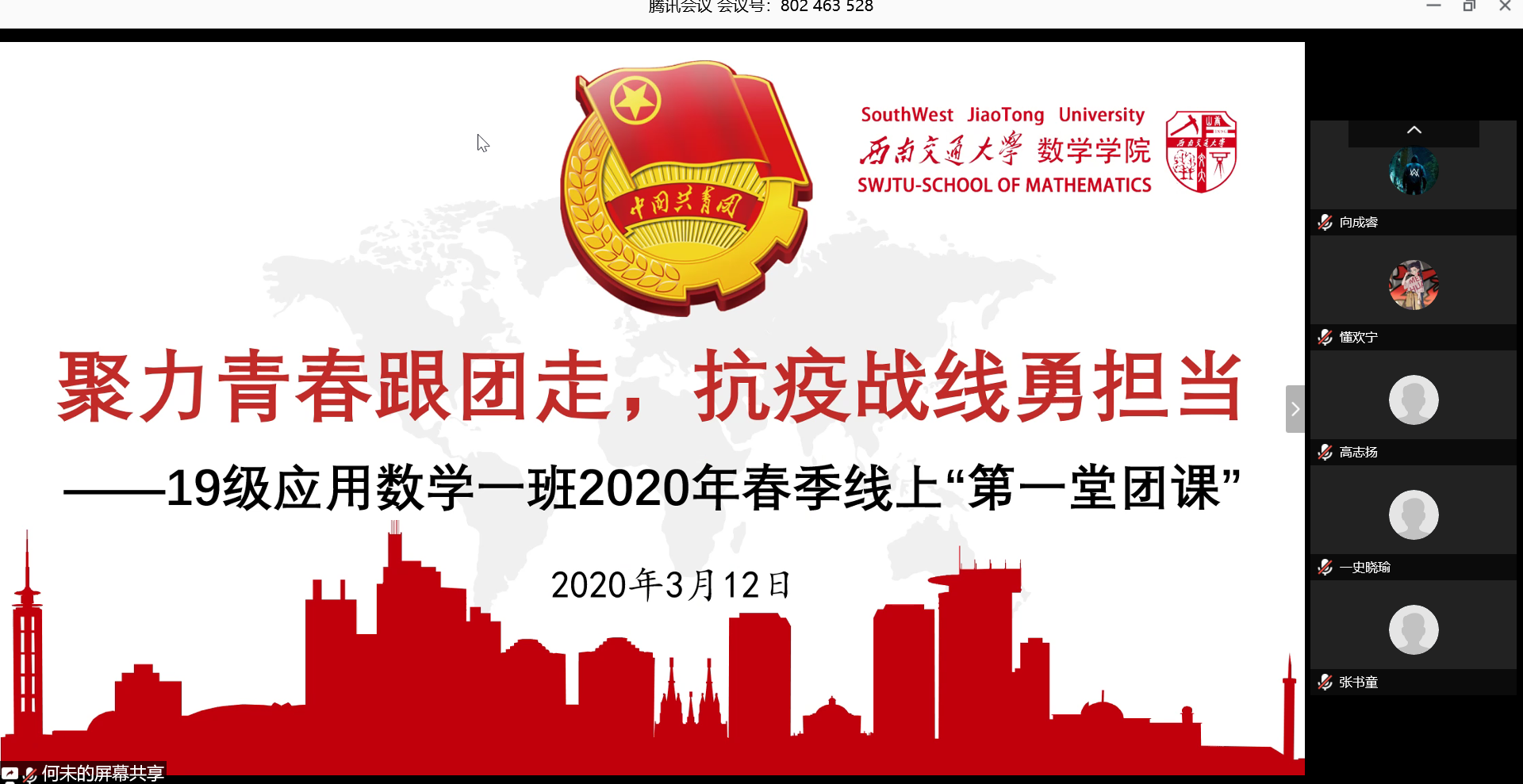 疫情当下,开学延迟。为响应学院团委号召,3044永利集团最新链接数学与应用数学2019级1班团支部全体团员在团支书冯玉的带领下,参加了以“聚力青春跟团走,抗疫战线勇担当”为主题的2020年春季线上第一堂团课。3044永利集团最新链接2019级辅导员王亚梅,团委组织部部长林玉受邀参加,并做团课分享。