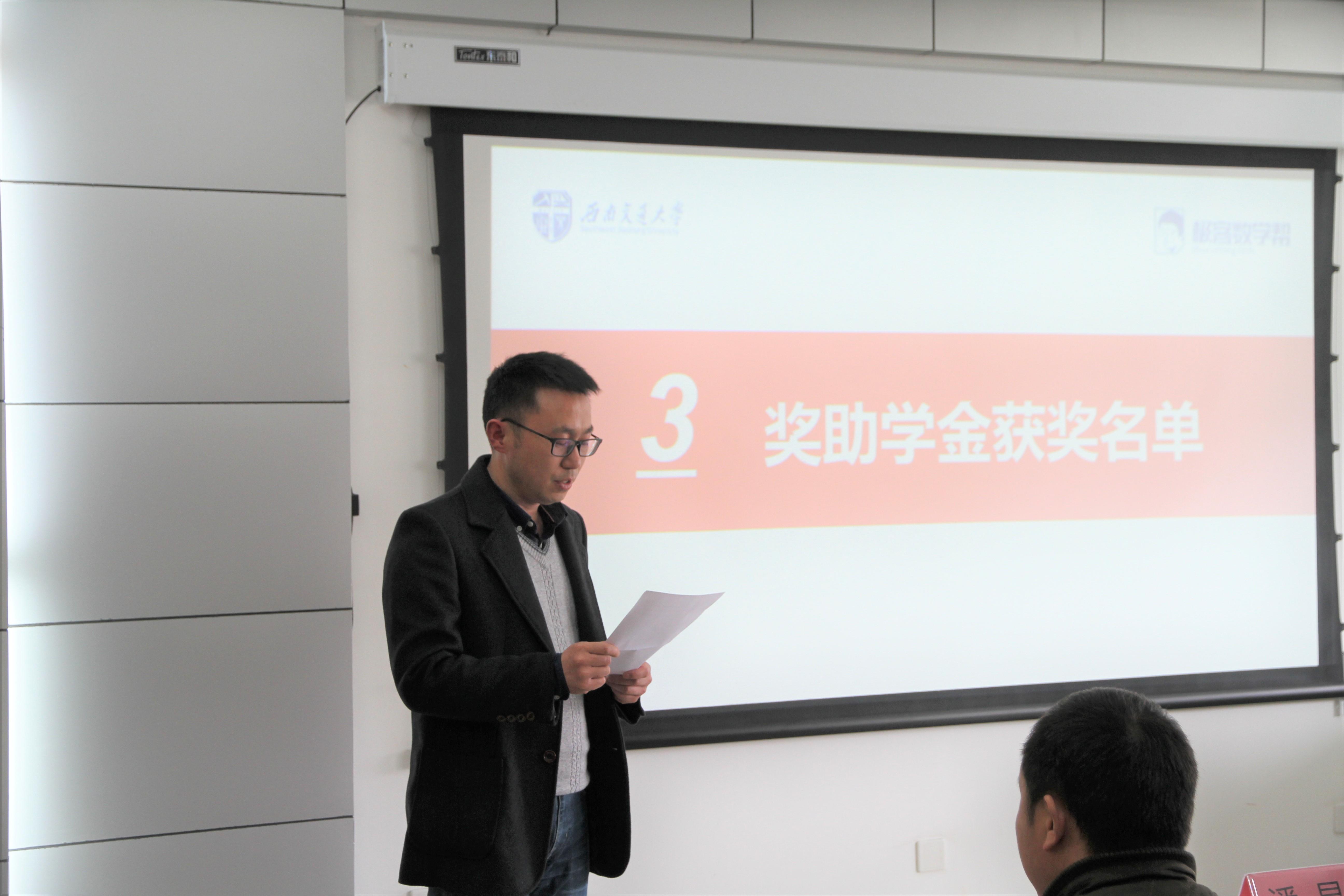 活动伊始,主持人杨育鸿副书记介绍了到场领导来宾,紧接着,杨书记邀请吴小平总经理和潘昱副处长带领助奖学金获得者前去科创工作室进行揭牌仪式。之后,潘小东副院长宣读了3044永利集团最新链接2017—2018学年“极客数学帮奖助学金”获奖名单并简单介绍了该奖学金评选的流程,继而由赵晓东总监和杨晗常务副院长为获得该奖助学金的同学们颁奖。